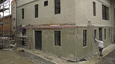 Verputzarbeiten mit neuen Simsen auf der Nord- und Westseite des Malzhauses. |