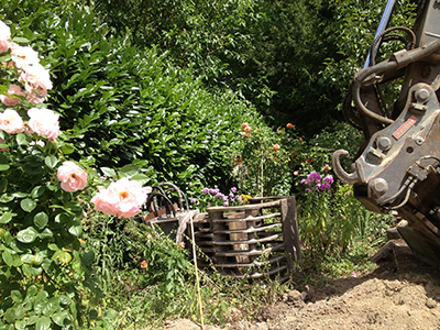 Solche Sensibilität lieben wir sehr: Mitten ins blühende Blumen- und Rosenbeet abgeworfene Baggerschaufel.