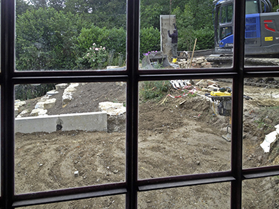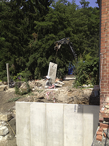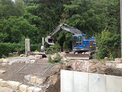 Oberhalb der Parkplätze im Garten des Pferdestalls wartet der Bagger auf das notwendig gewordene, erneute Ausgraben der Betonstützmauerelemente. Diese waren abgesackt ...