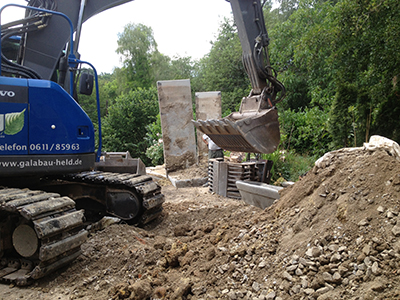 Die neu gesetzten Stützmauerelemente an der Terrasse des Pferdestalls.