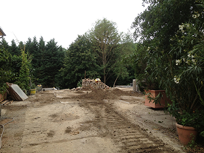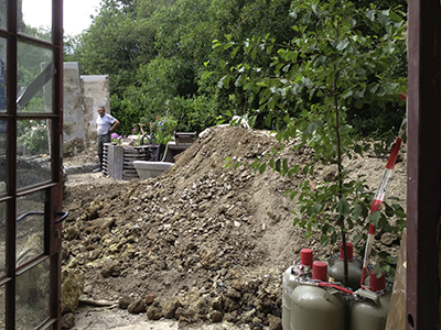 "Schlachtfeld" mit Aushub im Garten des Pferdestalls nach dem erneuten Ausgraben der bereits gesetzten aber abgesackten Betonstützmauerelemente.