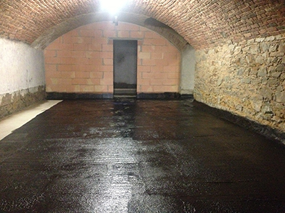 Rechts: Bodenabdichtung auf dem neuen Estrich im "Vinotto"-Gewölbe.