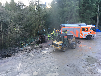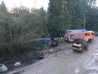 Die zahlreich auf der Südseite der Walkmühle unterirdisch gesetzten und miteinander verbundenen Löschwasserzisternen sind fertigestellt. Die Feuerwehr testet in einem letzten Schritt das System und die Löschwasserentnahme.
