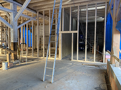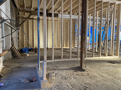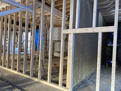 Holzständerkonstruktion für die Zwischenwände im Kühlschiff.