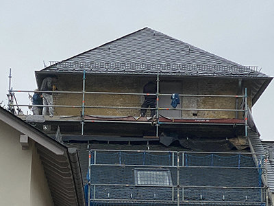 Der alte Putz an der Nordfassade des Turms wird entfernt.