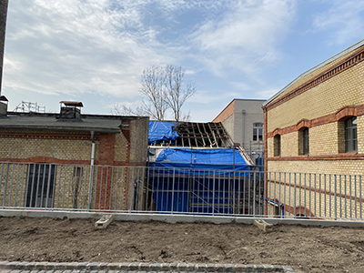 Geöffnete Dachfläche und östliche Giebelfront des Kühlschiffs. |