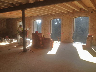 Estricharbeiten auf dem ausgebesserten Tonnengewölbe im Erdgeschoss des Südflügels. |