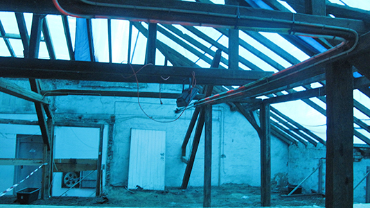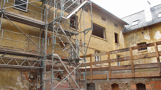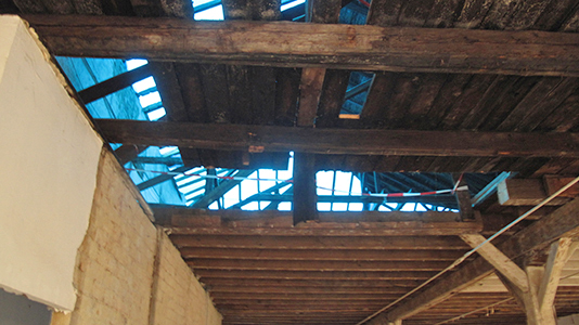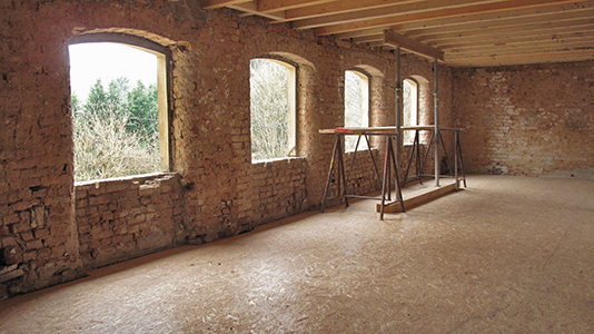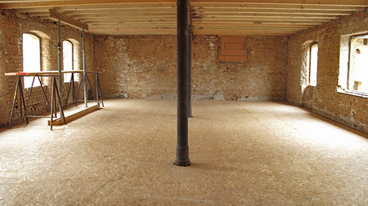 Obergeschoss des Getreidelagers. Hier werden Vorbereitungen zur kompletten Erneuerung der darüberliegenden Terrassendecke getroffen.