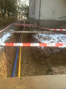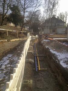 Verlegung von Gas- und Wasserleitungen im Erschließungsgraben der oberen Walkmühl-Zufahrt.