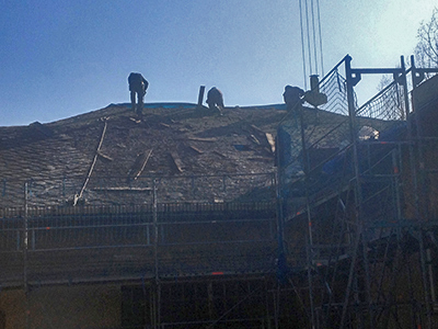 Das durch Planen geschützte, bereits partiell abgedeckte Dach des Malzhauses.