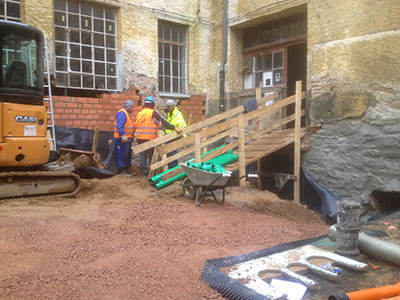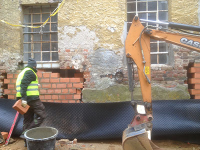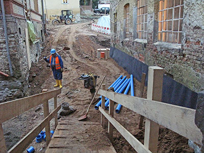 Die Fundamente des Malzhauses und Südflügels werden ausgebessert und gegen Feuchtigkeit geschützt.