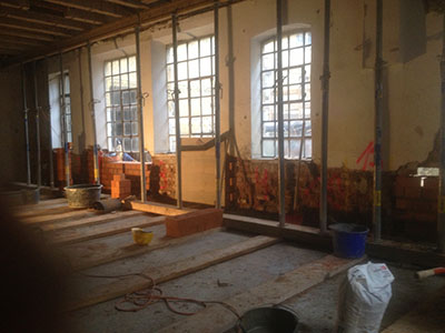 Unser hinterer Ausstellungsraum: Die seit langem marode Ziegelwand wird ersetzt.