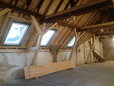 Neue Perspektiven und Dachfenster im Dachgeschoss des Pferdestalles. Hier wird voraussichtlich ein Gemeinschaftsatelier für mehrere Künstler entstehen. |
