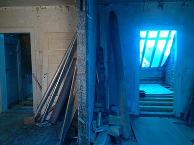 Das entkernte Zwischengeschoss des Südflügels. Zwischenzeitlich wurde es als provisorische und temporäre Unterkunft für in der Walkmühle gastierende Künstler genutzt. |