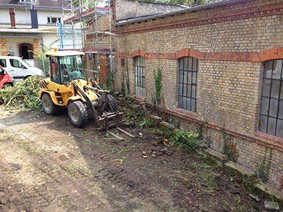 Die Bagger sind in den Eingangsbereich des Künstlervereins vorgerückt und beginnen, die Oberflächenbeläge zu entfernen. Diese Maßnahme bereitet die im Winter und Frühjahr bevorstehenden Tiefbauarbeiten vor, bei denen die gesamte Walkmühle eine neue technische Erschließung (Wasser, Gas, Elektrizität etc.) erhalten wird. |