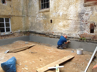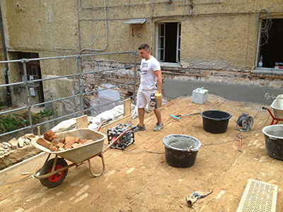 Entkernung im Mühlhaus und Vorbereitung des Betongusses der neuen Terrassendecke im Mühlenhof. |