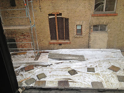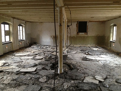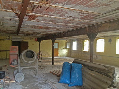 Entkerntes Obergeschoss im Südflügel und provisorisch gegen Nässe geschützte Mühlenhofterrasse. |