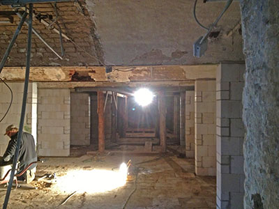 Statische Ertüchtigung durch Untermauern der Träger im Keller des Pferdestalles. |