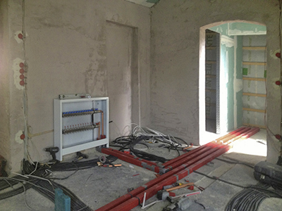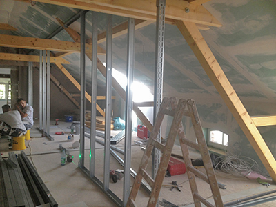 09.08.2018 Südflügel Dachgeschoss: Verlegung von Elektrik, Wasser- und Heizungsleitungen. Hier entsteht ein Gemeinschaftsatelier mit zugehöriger Bad- und Teekücheneinheit. |