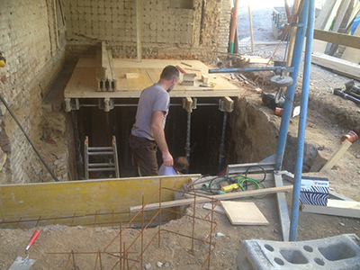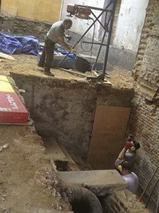11.09.2018 Innenhof vor dem Brauhaus: Verschalungs- und Armierungsarbeiten für die neu zu gießende Decke bzw. Bodenplatte über dem Keller des Brauhauses. |