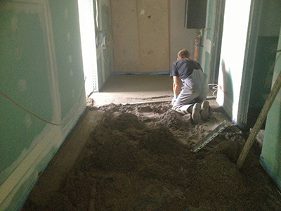 04.09.2018 Der Estrich im künftigen Gemeinschaftsatelier im Dachgeschoss des Pferdestalles wird gegossen und bedeckt die Heizschleifen der Fußbodenheizung. |