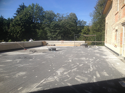 Die Fugen der neu gelegten Bodenplatten auf dem Dach des Getreidelagers werden mit feinem Splitt verfüllt. |