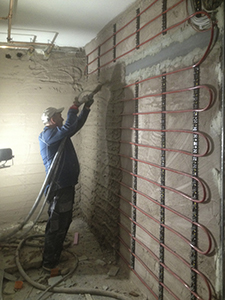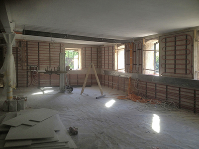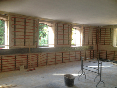 17.10.2018 Obergeschoss Getreidelager: Gut sichtbar die Schleifen der Wandheizung, die sich auch durch die Leibungen der Fensteröffnungen zieht. |