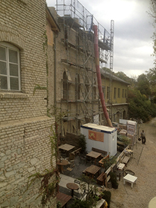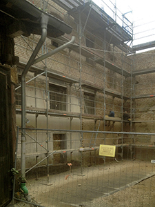 Innenhof vor dem Brauhaus: Der alte Putz wird abgeschlagen und das ursprüngliche Mauerwerk wieder sichtbar. |