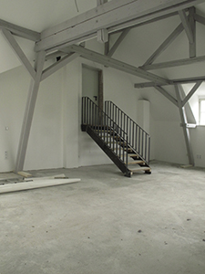 16.03.2019 Die neue Verbindungstreppe vom Gemeinschaftsatelier im Dachgeschoss Pferdestall zum Dachgeschoss Südflügel ist da. Diese Verbindung dient als zweiter Rettungsweg im Brandfall. |