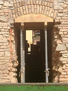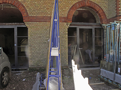 Einbau der neuen Türen und Bogenfenster an der ebenerdigen Nordseite des Sudhauses.