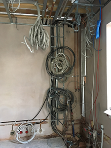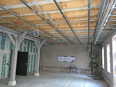 Verkabelungen im Veranstaltungsraum des Malzhauses. Hier wird nicht nur Strom verlegt, sondern auch Video- und Audiokabel mit Wand- und Deckenauslässen.