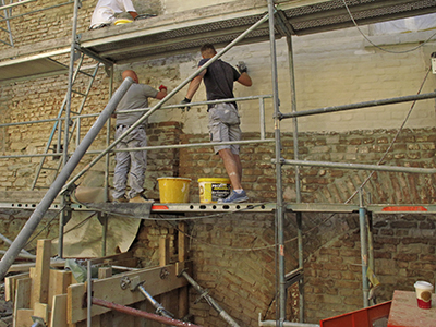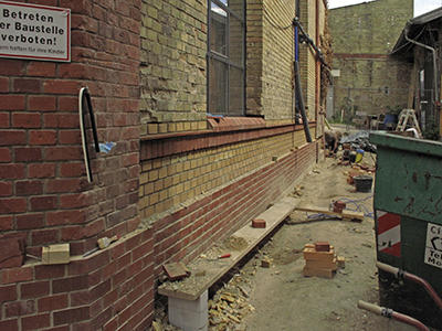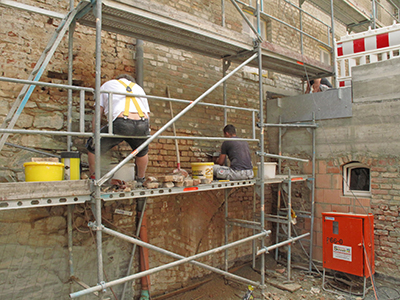 Selektive Erneuerung der Ziegel an der Sudhausfassade.
