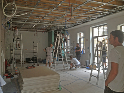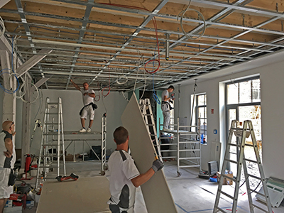 Montage der abgehängten Decke im Veranstaltungsraum des Malzhaus EGs.